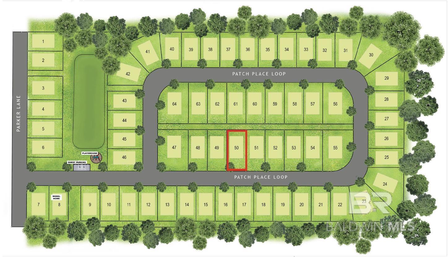 The Palmetto plan from Tower Homes offers an open, functional layout with thoughtful separation of space. The spacious living room anchors the home and flows seamlessly into the kitchen, featuring a large island with quartz countertops, stainless steel appliances, a walk-in pantry, and an adjacent breakfast area ideal for entertaining and everyday living. A dedicated dining room adds flexibility for formal meals or gatherings, or additional living space. The private primary suite includes a generous bedroom, an ensuite bath with soaking tub, a separate shower, dual vanities, and a walk-in closet. Three additional bedrooms are positioned separately with convenient access to a full hall bath, offering flexibility for guests, a home office, or growing households. Additional highlights include a dedicated laundry room, ample storage, covered front and rear porches for outdoor enjoyment, and a 2-car garage. An innovative layout that balances openness with privacy, designed for comfortable modern living. Located on lot 50 in Patch Place, the 64-lot subdivision is located just off CR 13 at the end of Parker Lane. It is minutes from I-10 and is close to schools, shopping, parks, and more. Gold Fortified, the home includes a 1-year builder warranty, 10-year PWSC structural warranty, & a 1-year Termite bond with Formosan coverage. One or more principals of the selling entity are licensed real estate agents and or Brokers in AL. Floor plans are for example only. Buyer to verify all information during due diligence.